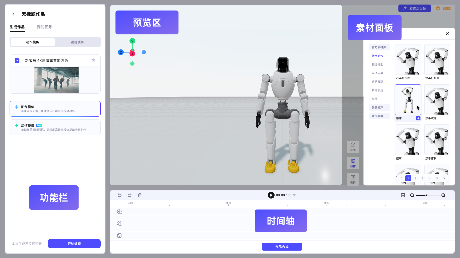 除了利用视频、音频帮助用户开发动作外,为了提升用户创作效率与便捷性,「灵创」平台为用户提供了官方素材库,涵盖11类场景超过180套标准化动作与140套表情模板,用户可以从素材库中直接调用动作、表情进行动作组合创作